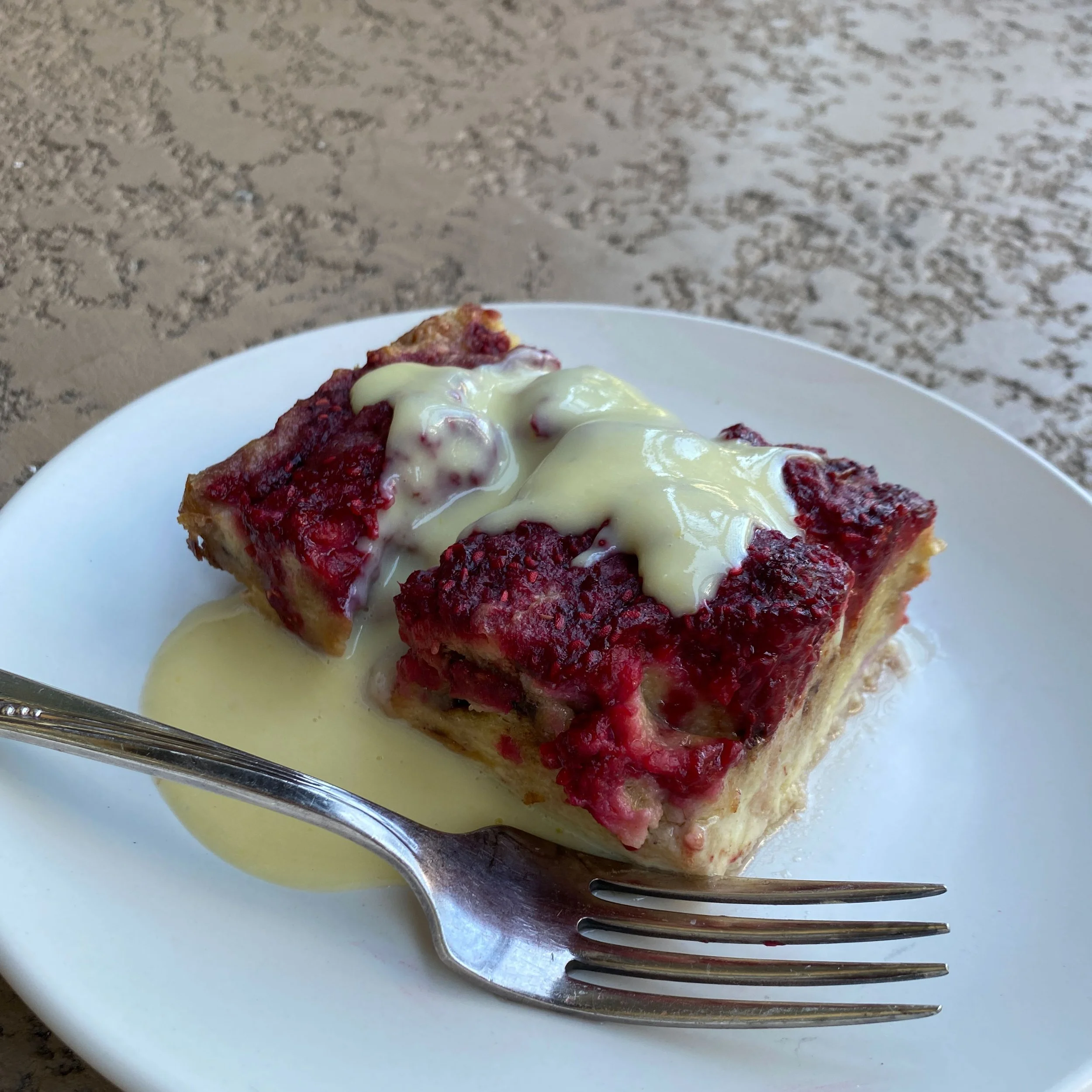 Raspberry chocolate chip brioche bread pudding, topped with pastry cream. This is the kind of dessert that is simple to whip up, uses up any leftover ingredients and easily turns out delicious!