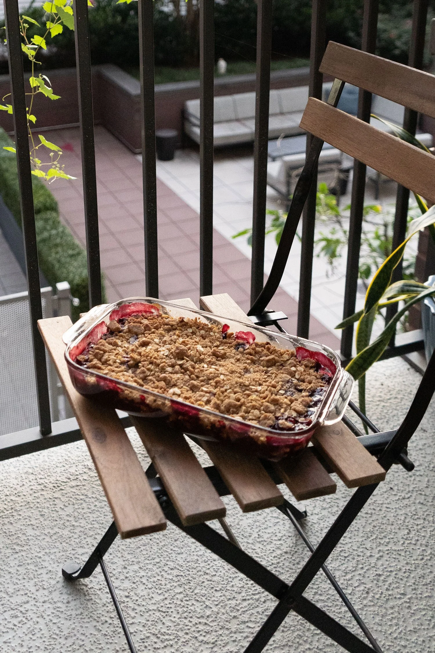 Cherry crisp that I prepared for a poolside grill day with friends. Before devouring this dessert, we enjoyed steak, corn on the cob and veggie skewers.