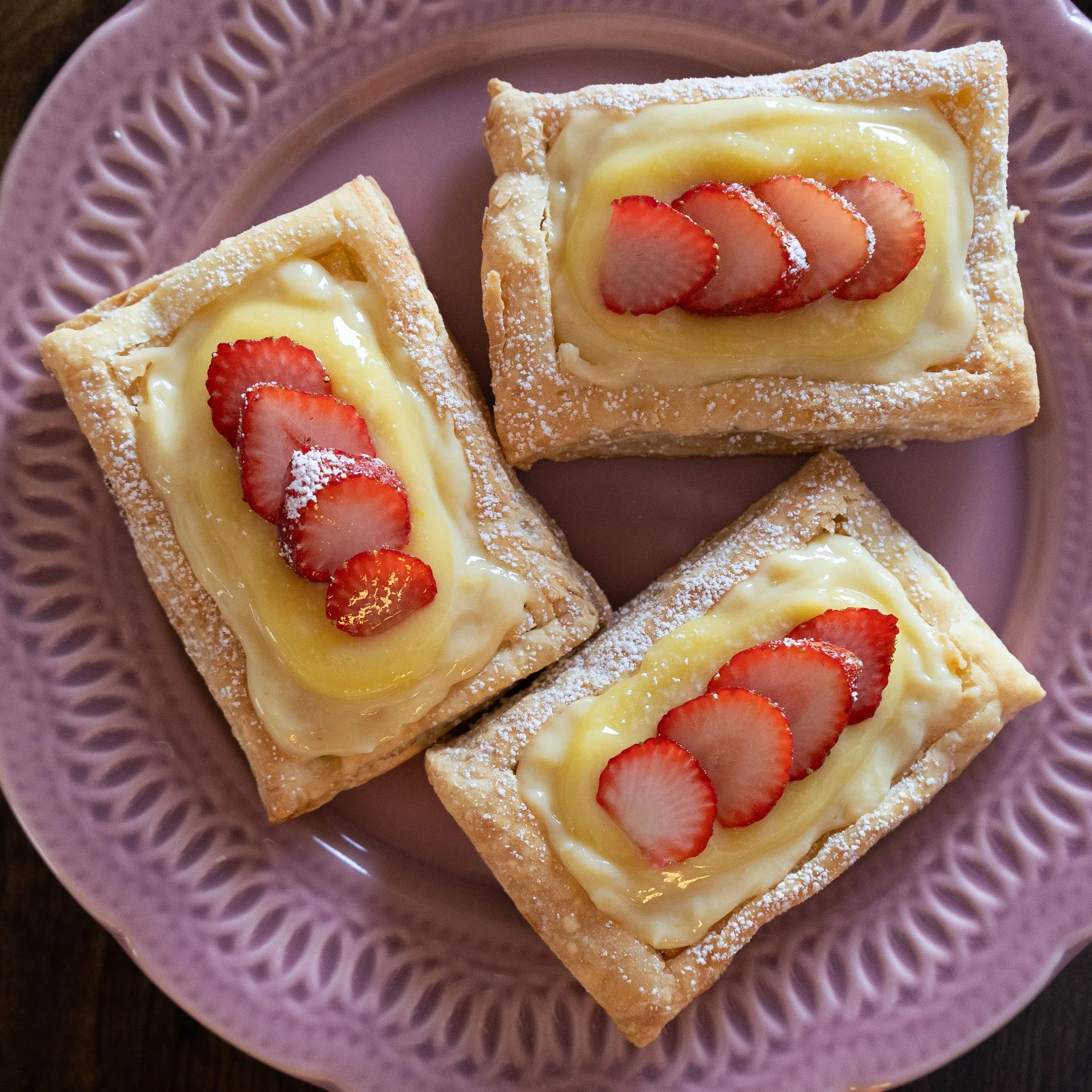 Pastry cream and lemon curd puff pastry tarts topped with fresh strawberries.
