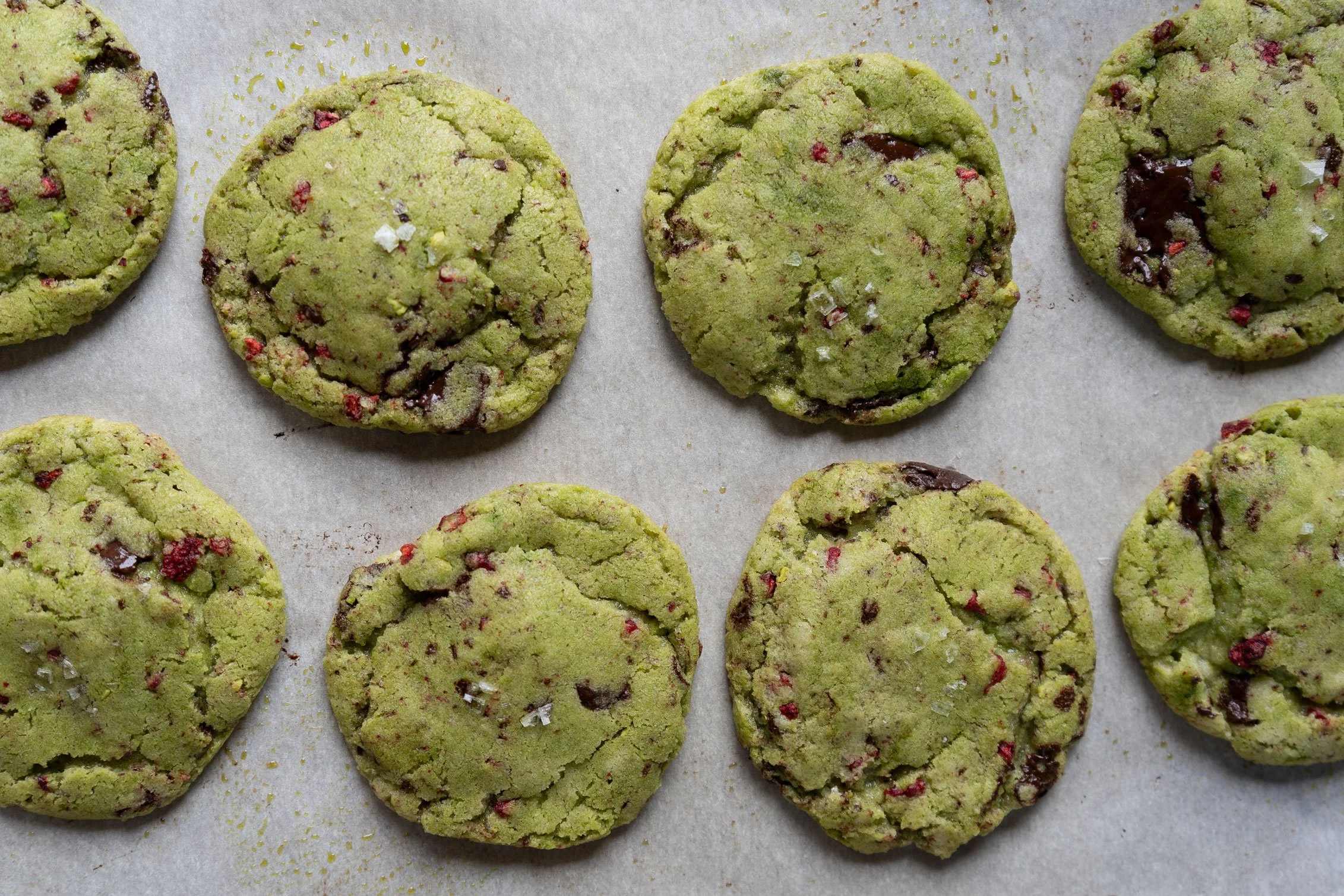 Raspberry matcha pistachio chocolate chip cookies, with a sprinkle of flaky salt. I brought these to a lakefront picnic with the girls!